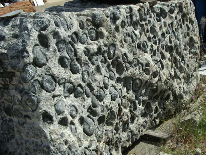 This particular example of orbicular rock is over two and a half billion years old. It is an igneous rock which has crystallised from molten material pooled in the Earth’s crust. Normally as the melt cools, many crystals would start to form, but here the sites for crystallisation were few, and radiating/concentric crystal frameworks developed, with the different layers reflecting the conditions at the time of formation. The orbs were formed in parts of the magma chamber which were ideal for rapid crystal growth, and it is envisaged that the developing spheres were swept up and down by currents in the molten rock, just like hailstones are in a storm cloud, each journey adding a new layer of crystals. Eventually the entire rock solidified. In this deposit the original rock has been overprinted by later events, particularly the replacement by other minerals of much of the matrix surrounding the orbs.